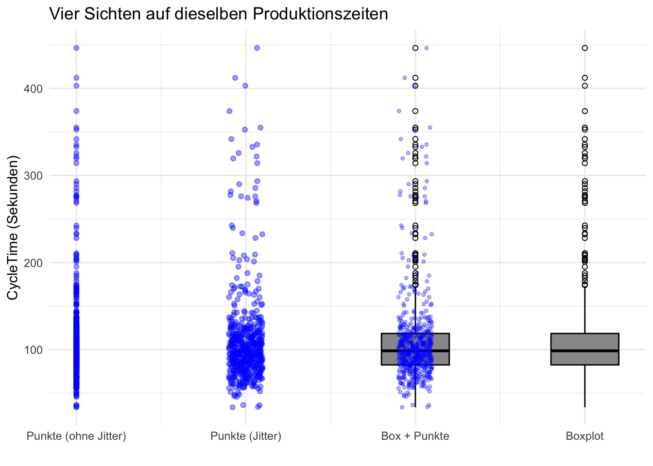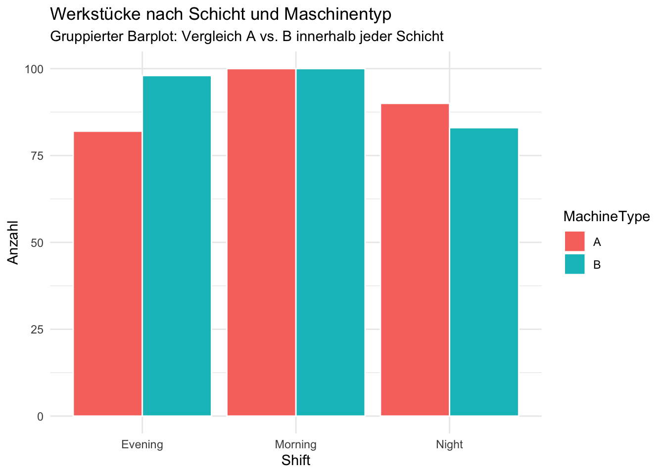 5) Aufteilen in mehrere kleine Grafiken: facet_* - facet_wrap(~ Shift) → eine Grafik pro Ausprägung (z. B. pro Schicht) - facet_grid(MachineType ~ Shift) → Matrix aus Teilgrafiken